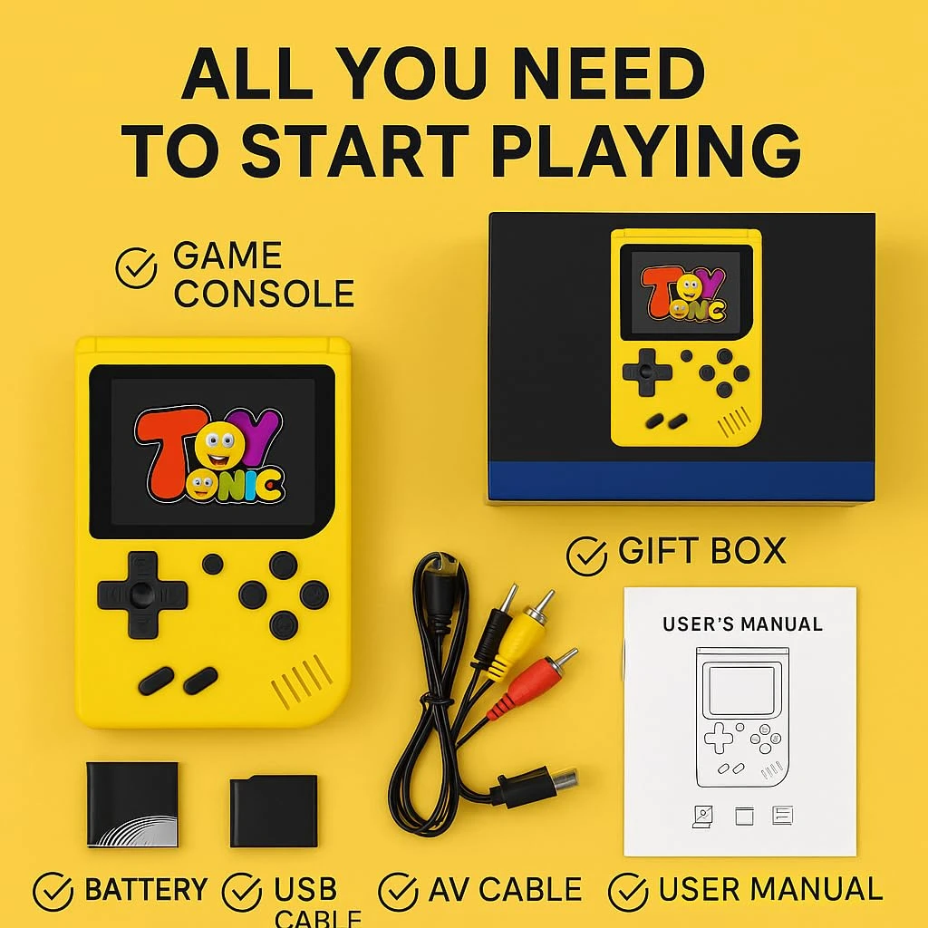 • ? Compact & Stylish Design – Lightweight, pocket-friendly console with a vibrant yellow body and classic design, perfect for travel, gifting, or casual gaming sessions.